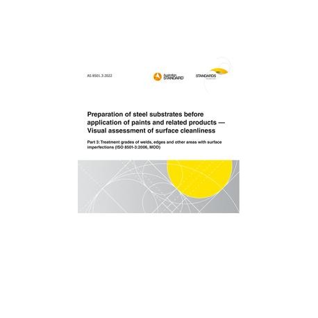 AS 8501.3:2022 Preparation of steel substrates before application of paints and related products - Visual assessment of surface cleanliness, Part 3: Treatment grades of welds, edges and other areas with surface imperfections (ISO 8501-3:2006, MOD)